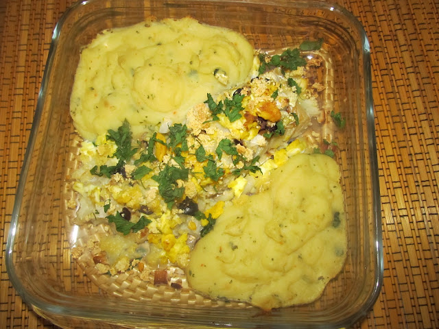 Colocar o bacalhau livre de peles num pirex ou outro recipiente de ir forno e reservar. Fazer uma mistura de cebola, ovo cozido, azeitonas, salsa tudo bem picado, acrescentar ainda broa de milho esfarelada, deitar o preparado sobre o bacalhau. Temperar de sal e pimenta e regar com azeite. À parte preparar puré de batata conforme a preferência e por fim colocar o puré à volta do bacalhau. Levar ao forno a 150º cerca de 40 minutos.