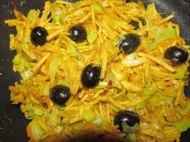 Cortar o alho francês em rodelas finas (só a parte branca a parte verde usar para sopa ou outra receita) e refogar no azeite. Quando o alho estiver bem tenro acrescentar a batata e envolver. Por fim colocar as azeitonas e os ovos já batidos, temperar com pimenta e envolver bem até os ovos ficarem bem distribuídos.