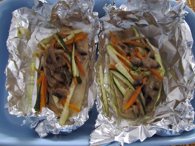 Colocar os filetes sobre o papel de alumínio - dentro de um tabuleiro - e temperar com sal e pimenta.Cortar em tiras muito fininhas todos os legumes e colocar sobre os filetes de forma a ficar uma boa camada de legumes. Por cima temperar com um pouco de sal, pimenta e alho e pó e por fim regar com um pouco de azeite. Embrulhar o conteúdo no papel de alumínio e levar ao forno a 150º durante cerca de 30 minutos.