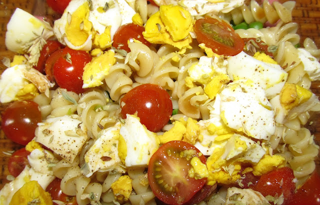 Cozer a massa com as ervilhas, sal e um fio de azeite. Escorrer e colocar numa saladeira e deixar arrefecer.
