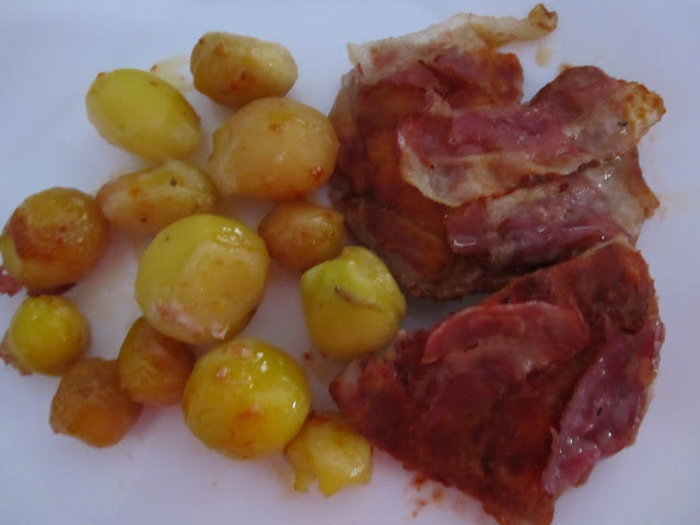 Colocar as batatas peladas à volta da carne e cobrir tudo com bacon e por fim regar tudo com um pouco de azeite. Levar ao forno a 200º durante 30 minutos ou até tudo estar dourado.