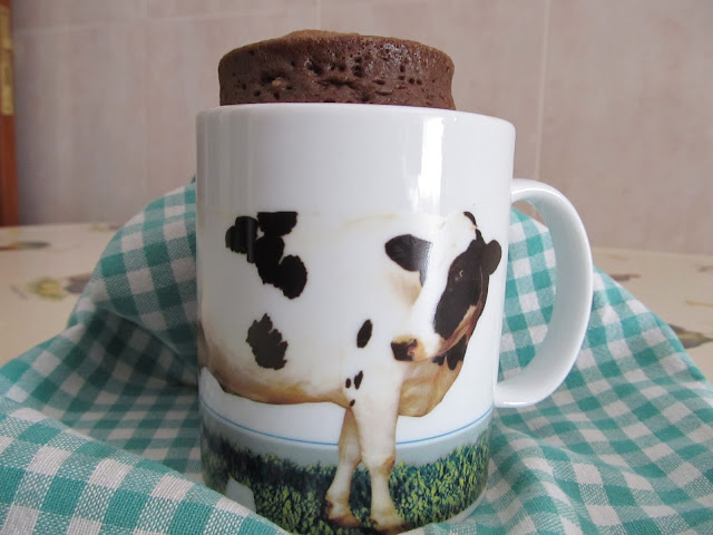 Untar a caneca com manteiga e polvilhar com farinha. Colocar a mistura na caneca e levar ao microondas durante 3 minutos em potência máxima.