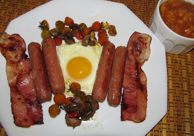 Numa frigideira anti aderente deixar tostar as fatias de bacon, retirar e reservar. Na mesma frigideira colocar um pouco de azeite e acrescentar os tomates cherry e os cogumelos cortados a meio, temperar com sal, pimenta e oregãos e deixar cozinhar por alguns minutos. Juntar as salsichas e por fim colocar os ovos ao centro, deixar cozinhar os ovos e por fim temperar as gemas com sal e pimenta. À parte preparar o feijão: picar a cebola e deixar refogar em azeite, acrescentar o feijão branco e por fim adicionar polpa de tomate, temperar com sal e pimenta.