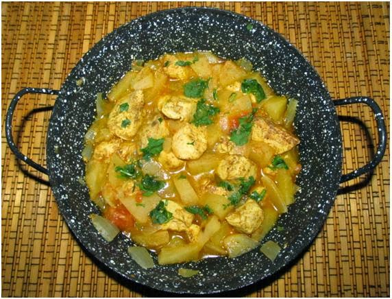 Depois de cortar os peitos de frango em pedaços, temperar com o caril, a canela, a paprika, o vinagre e o louro, deixar repousar cerca de 30 minutos.