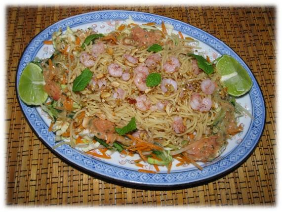 Numa travessa colocar os legumes ralados e envolver no molho de tomate acabado de preparar. Juntar os noodles - já cozinhados e os camarões. Por fim polvilhar com os frutos secos e as sementes. Juntar quartos de lima e folhas de hortelã.