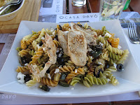 Numa saladeira, juntar a massa, os legumes, as azeitonas e o feta. Polvilhar com sementes de sésamo e mais um pouco de orégãos.