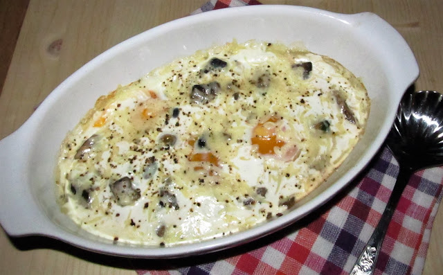 Retirar do forno e cobrir com o queijo e as natas, levar novamente ao forno, cerca de 2 minutos. Por fim polvilhar com pimenta preta acabada de moer.